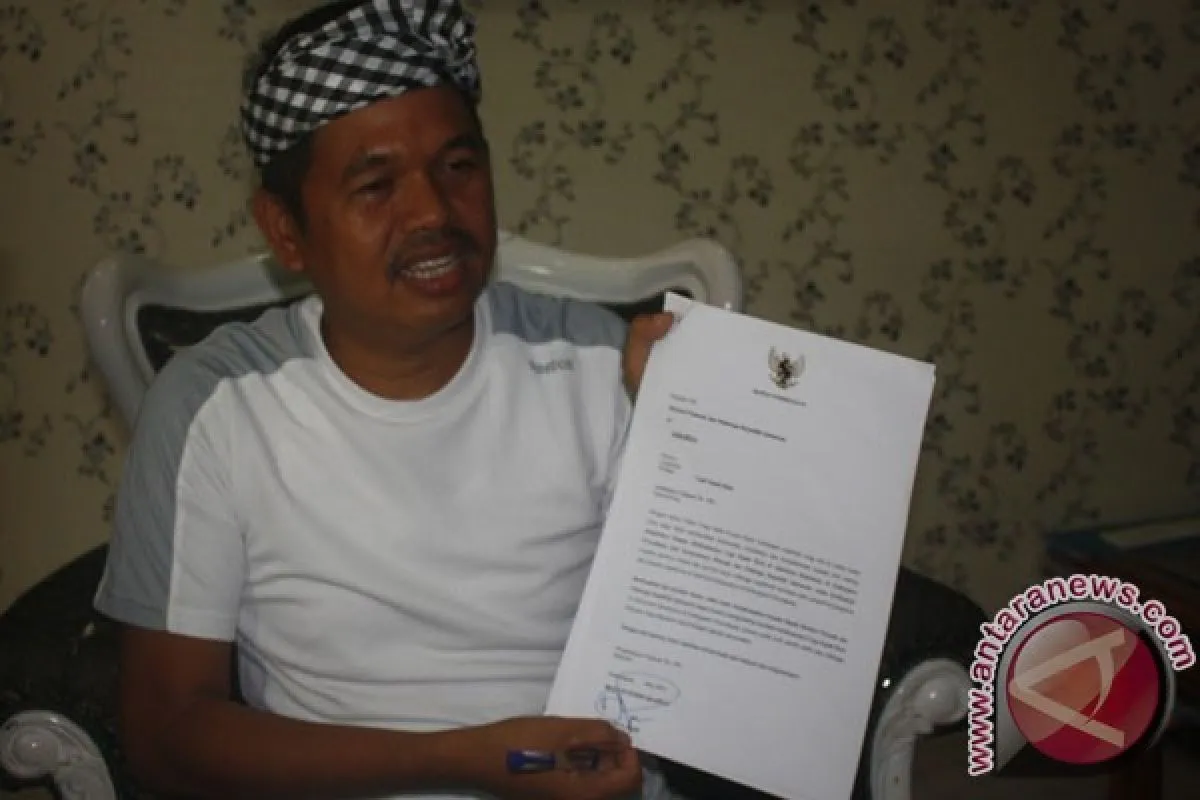 Bupati Purwakarta Dedi Mulyadi menunjukkan surat yang akan dikirimkan ke Menpora terkait dengan penghentian atau penundaan sementara kompetisi Liga Indonesia, di kompleks Pemkab Purwakarta, Selasa (5/5/15). (Foto Antara/M.Ali Khumaini/Dok).