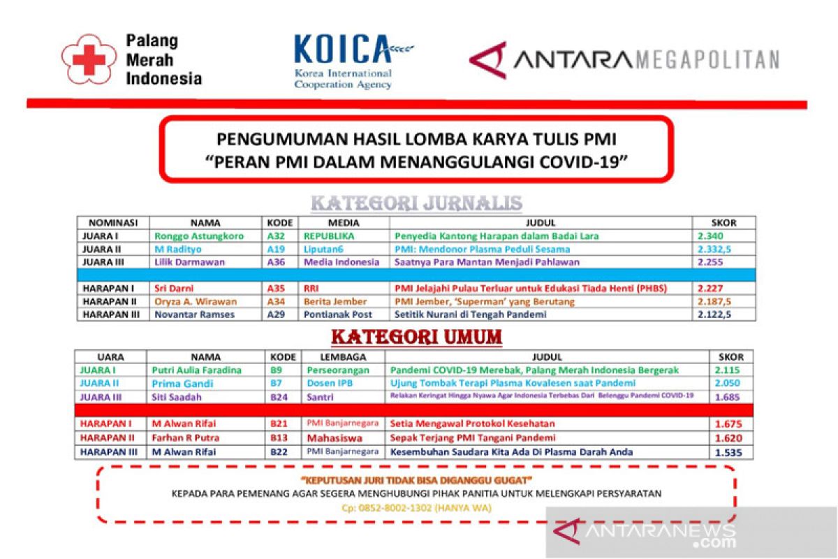 Berikut nama-nama pemenang kejuaraan karya tulis PMI dengan tema "Peran PMI Dalam Menanggulangi COVID-19" dari kategori jurnalis, Juara I disabet Ronggo Astungkoro dari Republika dengan judul "Penyedia Kantong Harapan Dalam Badai Lara".