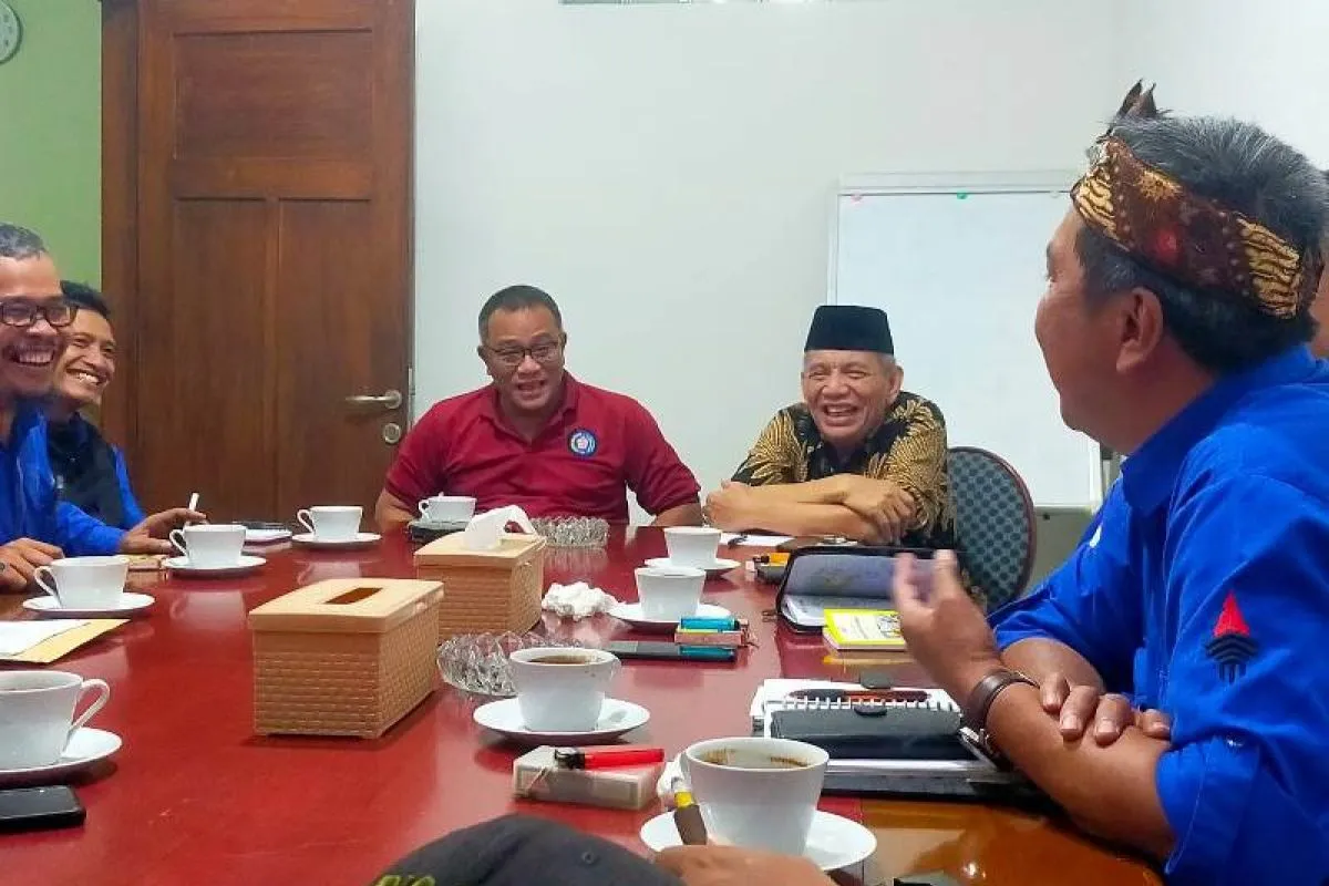Suasana pertemuan Ketua Umum DPP KSPSI Moh Jumhur Hidayat (kaus merah). (Antara/HO).