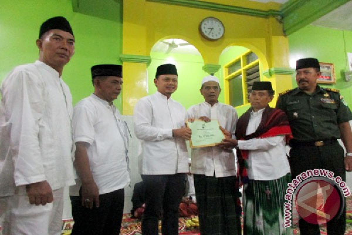 Wali Kota Bogor Bima Arya (tiga kiri) saat menyerahkan bantuan Rp15 juta untuk pembangunan masjid, pada Shalat Tarawih Keliling (Tarling) Ramadhan 1437 H/2016 M, di Masjid Nurul Huda, Kel. Bojong Kerta, Kec. Bogor Selatan. (ANTARA FOTO/M.Tohamaksun/D
