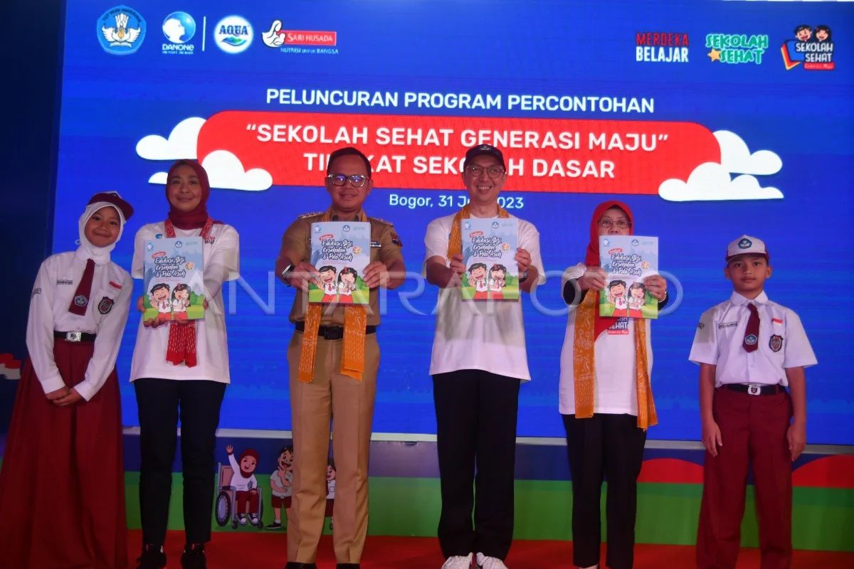 Direktur Jenderal Pendidikan Anak Usia Dini, Pendidikan Dasar dan Pendidikan Menengah Kemendikbudristek Iwan Syahril (ketiga kanan) bersama Wali Kota Bogor Bima Arya (ketiga kiri), Vice President General Secretary Danone Indonesia Vera Galuh Sugijanto (kedua kiri) dan Guru Besar Fakultas Ekologi Manusia (FEMA) IPB University Sri Anna Marliyati (kedua kanan) menunjukkan buku modul saat peluncuran program percontohan sekolah sehat generasi maju tingkat sekolah dasar di SDN Bangka 3, Kota Bogor, Jawa Barat, Senin (31/7/2023). Kemendikbudristek bersama Danone Indonesia menyelenggarakan Kampanye Sekolah Sehat melalui program percontohan sekolah sehat generasi maju untuk mewujudkan anak Indonesia yang sehat, kuat, dan cerdas berkarakter guna mempersiapkan generasi emas Indonesia 2045.