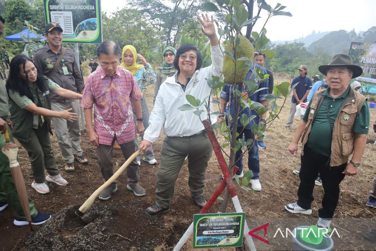 Menteri Lingkungan Hidup dan kehutanan (KLHK) RI, Siti Nurbaya Bakar, melakukan penanaman pohon di Taman Safari Bogor, Sabtu (30/12/2023). Program penanaman pohon ini dilakukan serentak di seluruh Indonesia dalam menjaga lingkungan selama musim penghujan. Antara Arif Firmansyah