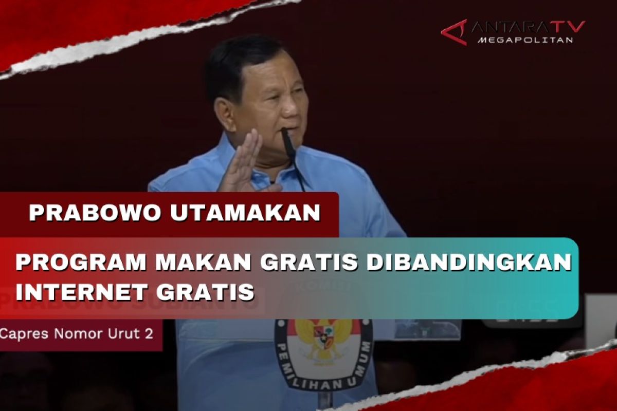 Prabowo Subianto di debat kelima calon presiden di JCC, Jakarta Pusat, Minggu (4/2), mengatakan lebih mengutamakan program makan gratis ketimbang internet gratis. Meski demikian, Prabowo juga tidak akan mengesampingkan keberlanjutan program internet gratis di sejumlah blank spot di pelosok Indonesia. (Afra Augesti/Rayyan/Amita Putri Caesaria).