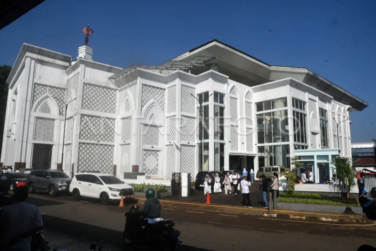 Pengendara motor melintas di depan Masjid Agung, Kota Bogor, Jawa Barat, Kamis (28/3/2024). Masjid Agung Kota Bogor yang terintegrasi dengan Alun-Alun Kota Bogor dan memiliki menara setinggi 50 meter tersebut dibangun dengan total anggaran mencapai Rp97 miliar yang berasal dari bantuan Pemerintah Provinsi Jawa Barat dan APBD Kota Bogor.