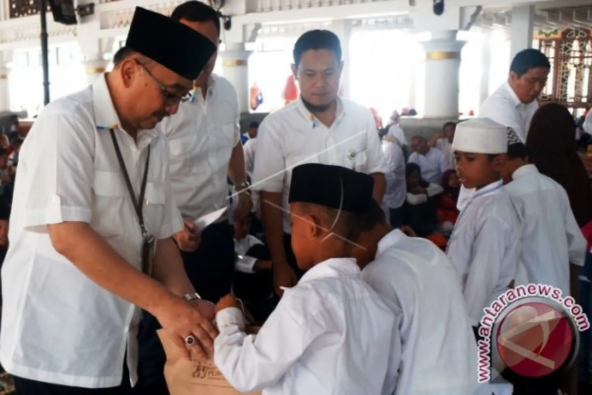 Direktur Teknik & Operasi PT Angkasa Pura II (Persero) Djoko Murjatmodjo (kiri) saat secara simbolis memberikan santunan kepada anak yatim di Masjid Nurul Barkah, Bandara Soekarno-Hatta, Tangerang, Banten. (ANTARA FOTO/HO/Chandra/Dok).
