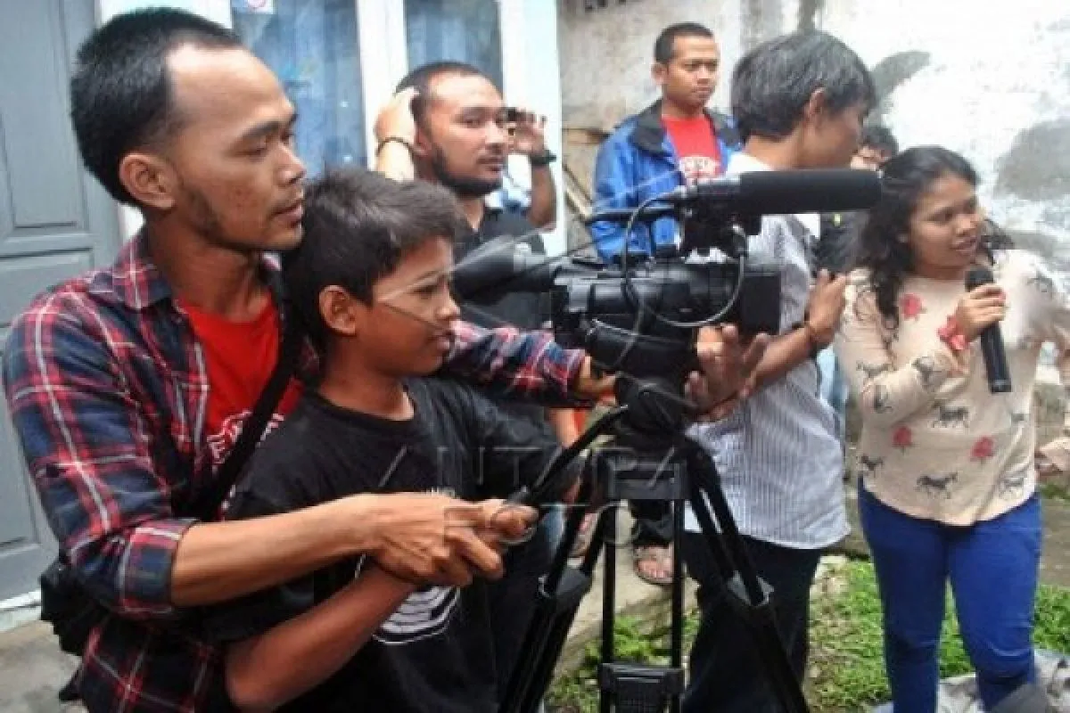 Dua kontributor TV Nasional mengajarkan cara menggunakan kamera dan meliput berita pada media elektronik televisi kepada anak-anak dari Komunitas Terminal Hujan di Kelurahan Baranangsiang, Kota Bogor, Jabar, Minggu (8/2). Kegiatan yang diselenggarakan Forum Wartawan Harian Bogor (FWHB) ini memberi pembelajaran tentang proses peliputan pada media cetak, elektronik dan on-line bagi anak-anak yang tidak mampu dalam rangka Hari Pers Nasional. (Foto Antara/Arif Firmansyah)