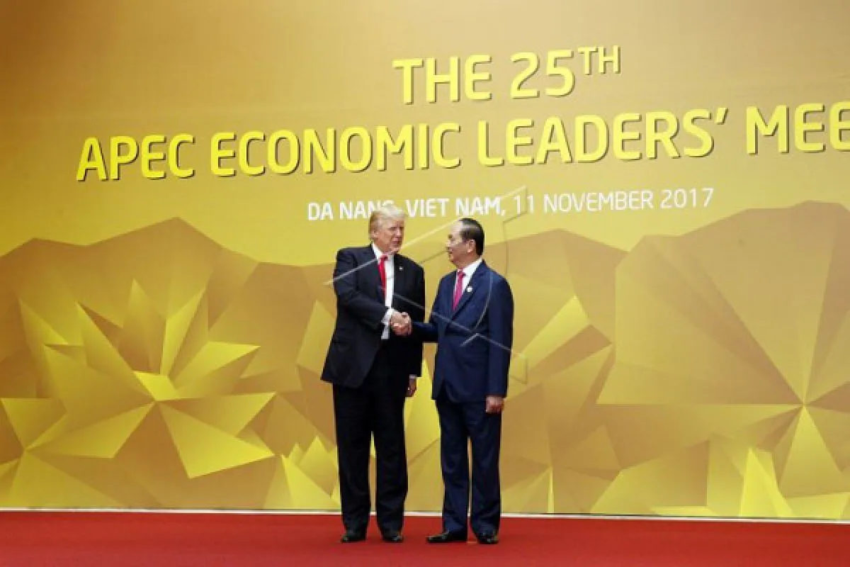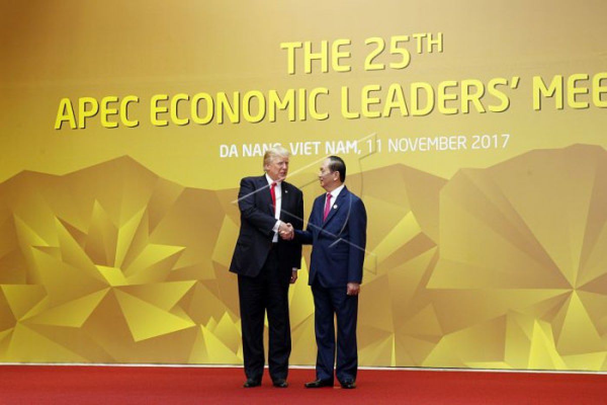 Presiden Amerika Serikat Donald Trump (kiri) berjabat tangan dengan Presiden Vietnam Tran Dai Quang (kanan) saat akan melakukan pertemuan Pemimpin Negara Ekonomi APEC, di Da Nang, Vietnam. (ANTARA FOTO/POOL/YU/kye).