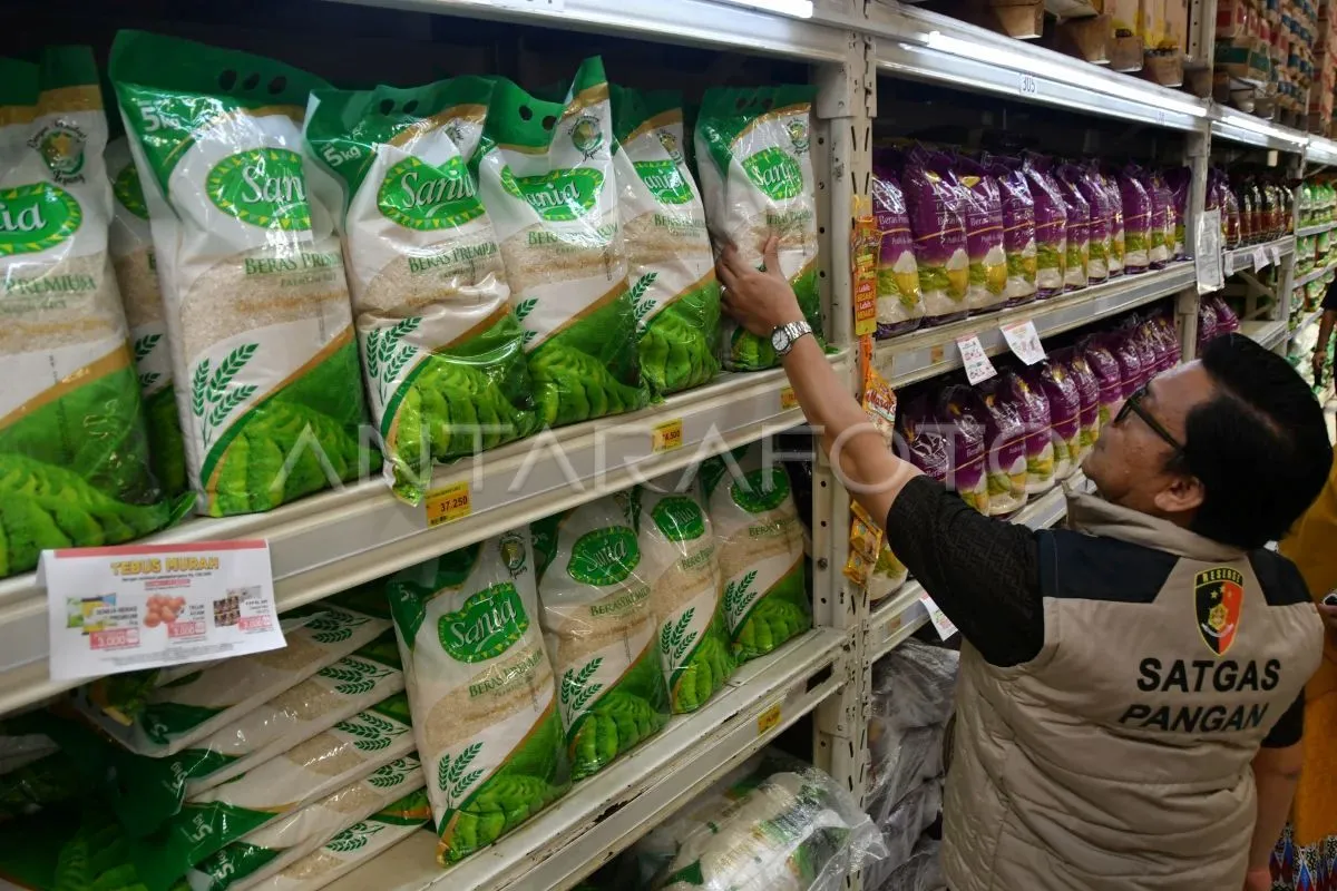 Petugas Satgas Pangan Polri memeriksa beras premium kemasan saat sidak beras oplosan di Lotte Mart, Kota Bogor, Jawa Barat, Selasa (22/7/2025). Sidak yang dilakukan Satgas Pangan Polri bersama Bapanas dan Dinas Koperasi, UKM, Perdagangan dan Perindustrian Kota Bogor tersebut untuk memastikan tidak ada beras oplosan yang dijual oleh pedagang maupun agen distributor. ANTARA FOTO/Arif Firmansyah/tom.