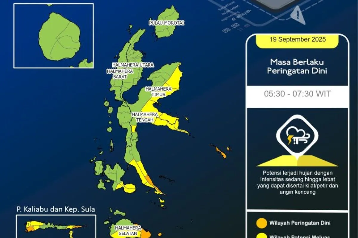 BMKG merinci potensi hujan sedang hingga lebat diperkirakan melanda sejumlah wilayah Maluku Utara pada 19 September 2025 di Morotai, Halmahera Utara, Halmahera Barat, Halmahera Timur, Halmahera Tengah, Kota Ternate, Kota Tidore Kepulauan, Halmahera Selatan, Pulau Taliabu, dan sekitarnya.