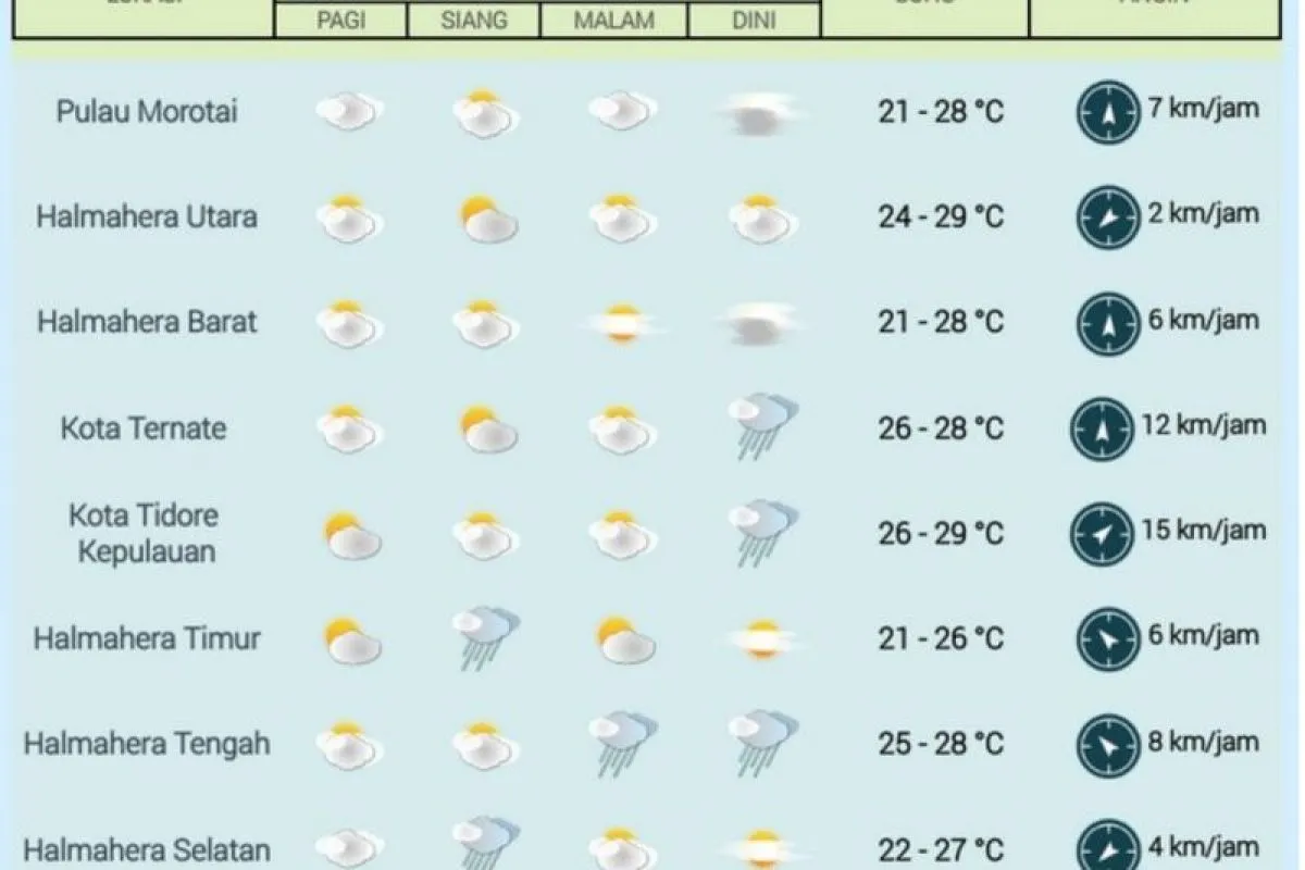 “Secara umum cuaca Maluku Utara pada periode ini diprakirakan berawan dengan potensi hujan intensitas ringan hingga lebat, baik pada pagi, siang, sore, malam maupun dini hari,” ujar Sakimin.