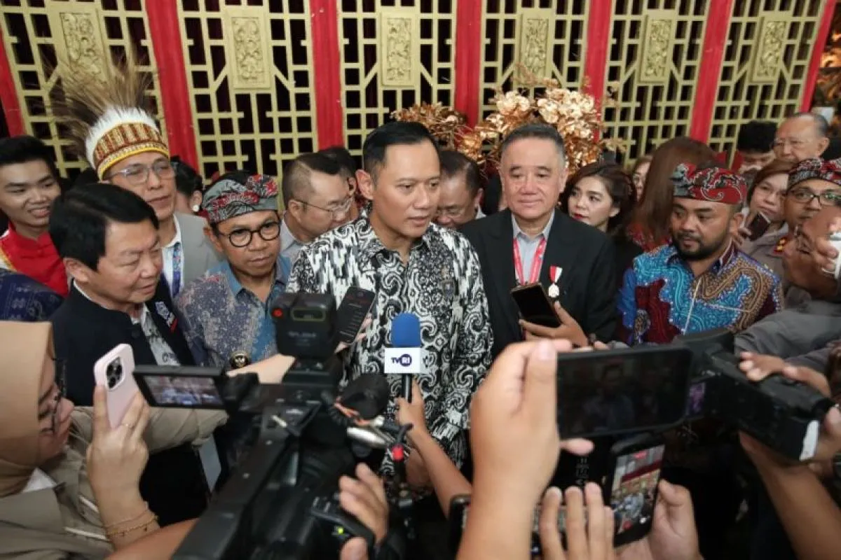 Menteri Koordinator Bidang Infrastruktur dan Pembangunan Kewilayahan Agus Harimurti Yudhoyono (AHY) Bersama pengurus Paguyuban Sosial Marga Tionghoa Indonesia (PSMTI) menjawab pertanyaan wartawan dalam rangka Rakernas XXI dan peringatan HUT ke-XXVII yang puncaknya di selenggarakan di Malang, Jawa Timur, Jumat (24/10/2025). (ANTARA/HO-PSMTI)