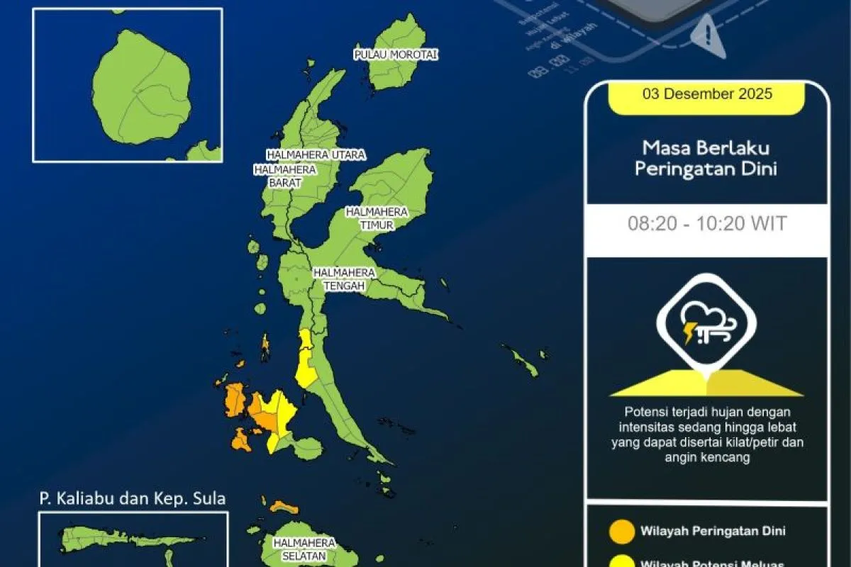 BMKG mengimbau masyarakat untuk waspada terhadap hujan intensitas sedang hingga lebat di wilayah Jailolo, Sofifi, Oba, Wasile, Maba, Patani, Kasiruta, Gane, Obi, Taliabu dan sekitarnya.