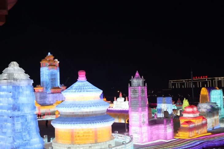 Taman es tersebut dibentuk dari 390.000 meter kubik balok es dan 420.000 meter kubik salju yang membentuk puluhan bangunan khas dari 31 ibu kota provinsi dan wilayah di China.