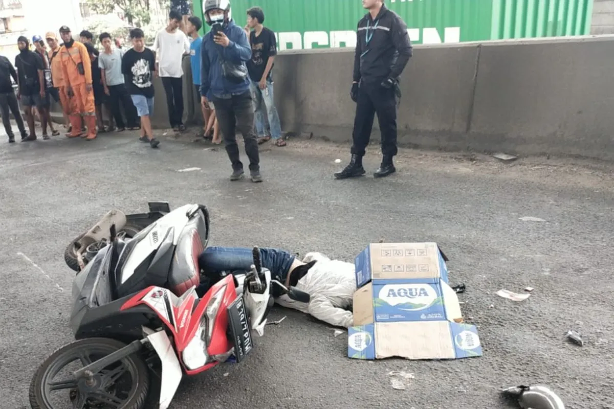 Secara bersamaan kendaraan truk trailer dengan nomor polisi B 9723 RK yang dikemudikan pria berinisial ET yang melaju di samping kiri sepeda motor yang dibawa korban dan menabrak korban.