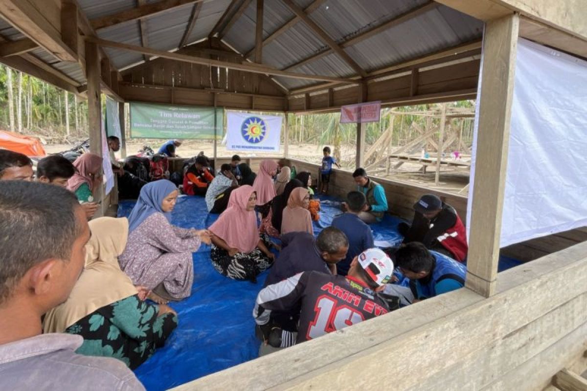 "Karena akses darat terputus oleh sungai dan genangan air, tim kemudian menggunakan perahu untuk menyeberang sebelum melanjutkan perjalanan berjalan kaki menanjak menuju tenda-tenda pengungsian warga," ujarnya.