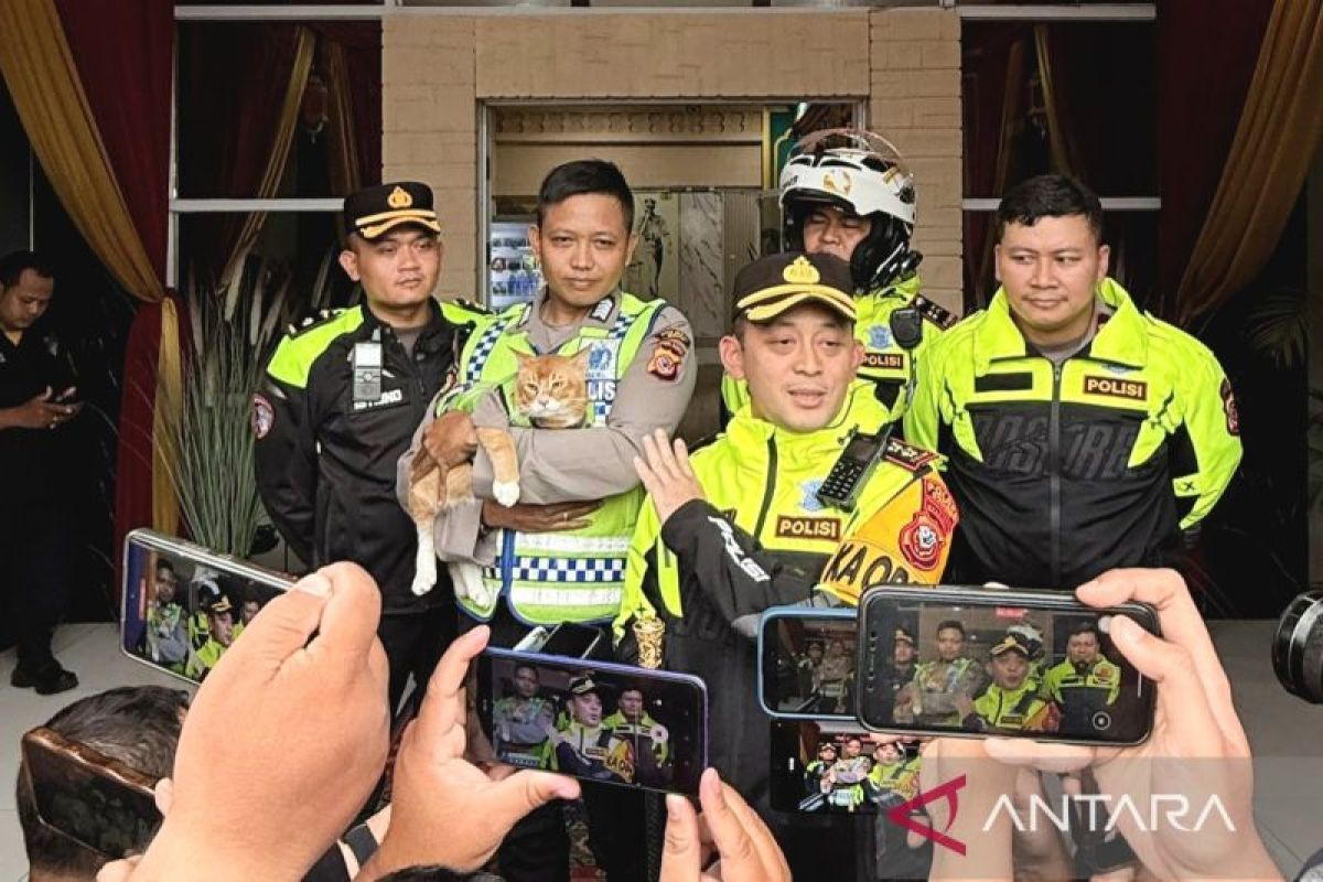 Kabupaten Bogor (ANTARA) - Seekor kucing berwarna oranye atau “oyen” mengenakan seragam polisi mini menjadi daya tarik di Pos Terpadu Gadog, Kabupaten Bogor, Jawa Barat, saat Operasi Ketupat Lodaya 2026.