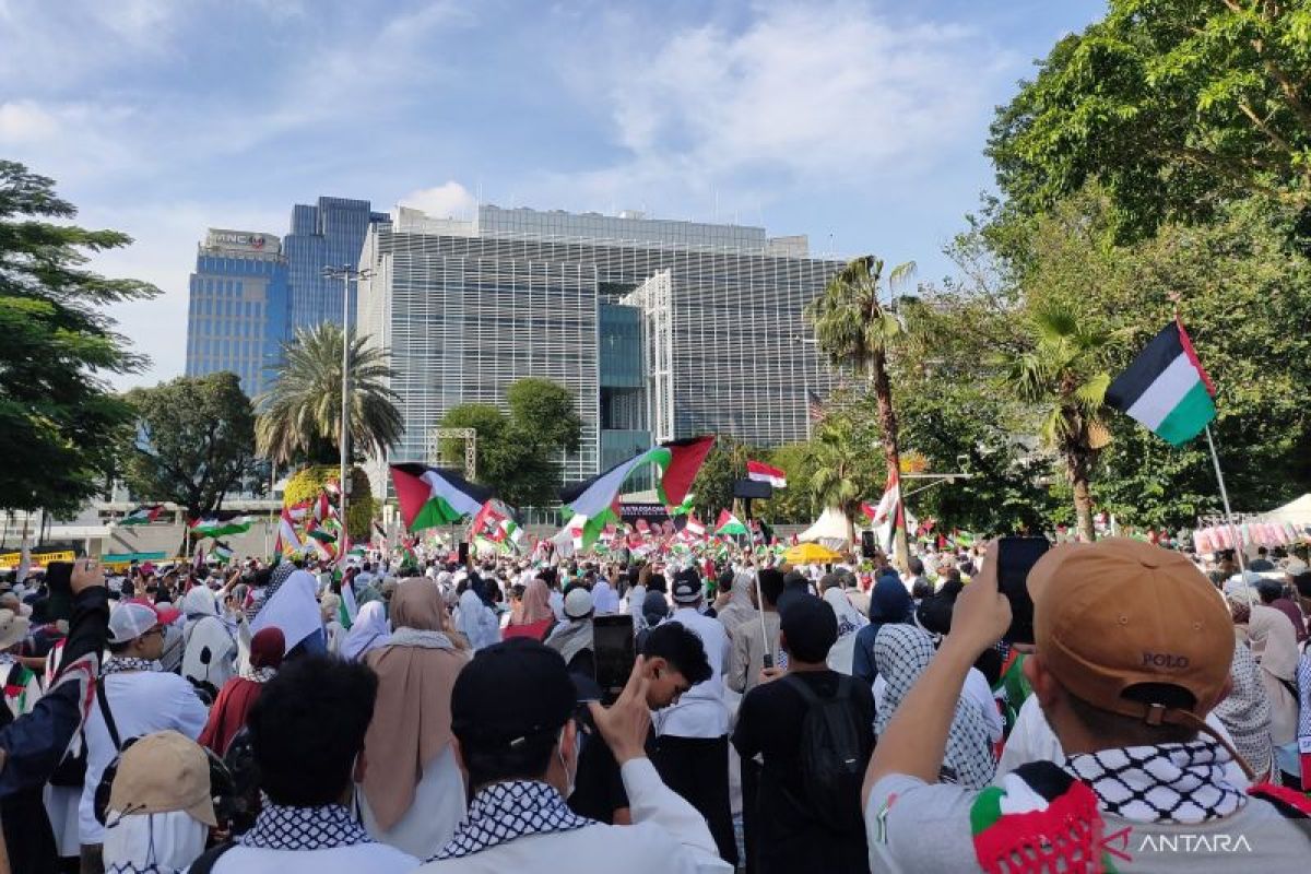 Jakarta (ANTARA) - Ribuan warga menggelar aksi di depan Kedutaan Besar Amerika Serikat untuk Indonesia, Jakarta Pusat, Minggu pagi, sebagai belasungkawa terhadap tiga personel TNI yang gugur di Lebanon Selatan saat menjalankan misi perdamaian PBB.