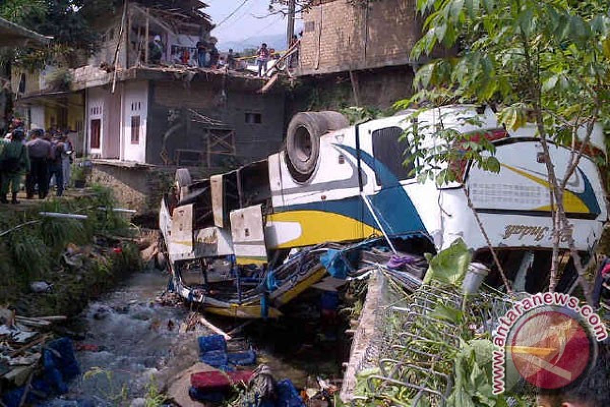 Bus Giri Indah mengalami kecelakaan maut di jalan Raya Puncak, Desa Tugu Utara, Kecamatan Cisarua, Rabu (21/8). Bus yang mengangkut penumpang jemaat GBI REM Kelapa Gading yang baru pulang ibadah kenaktian di wilayah Kota Bunga Cipanas.