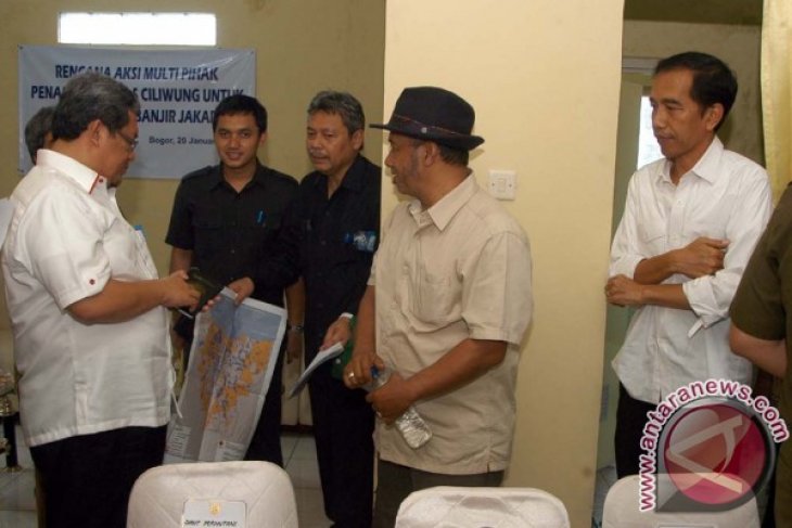 Gubernur Jawa Barat Ahmad Heryawan (kiri) dan Gubernur DKI Jakarta Joko Widodo (kanan) melakukan rapat koordinasi pengendalian banjir lintas wilayah di Bendungan Katulampa, Kota Bogor, Jabar, Senin (20/1). Rapat koordinasi yang dihadiri oleh perwakilan Propinsi Jabar, DKI Jakarta, Pemkot dan Pemkab Bogor serta Kementerian PU dan Kementerian LH tersebut membahas rencana pembangunan waduk dan situ serta sodetan di wilayah Bogor guna mengatasi masalah banjir di wilayah Jakarta. ANTARA FOTO/Jafkhairi/14