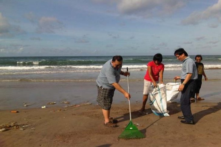 Dirut LKBN Antara Saiful Hadi memimpin aksi bersih-bersih Pantai Legian, Bali, yang merupakan salah satu program di sela-sela Rakernas Antara, Rabu. (Foto: Triono S)