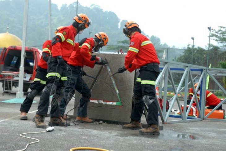 Tim rescue Antam Emergency Response Group menampilkan simulasi penyelamatan korban dan runtuhan gedung pada upacara penutupan bulan Kesehatan dan Keselamatan Kerja (K3) yang dihelat di Antam UBPE Pongkor, Kabupaten Bogor. (Foto: Antara/Humas Antam UBPE Pongkor)