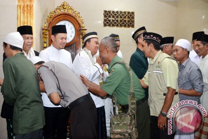 Wali Kota Bogor, Jawa Barat, Bima Arya Sugiarto (tengah) berjabat tangan dengan para jemaah shalat Isya dan Taraweh pada kegiatan Safari Ramadhan 1436 H/2015 M di Masjid Imam Ahmad bin Hambai/Nur Hasanah, Cilendek Timur, Kota Bogor, Jawa Barat. (ANTARA FOTO/M.Tohamaksun).