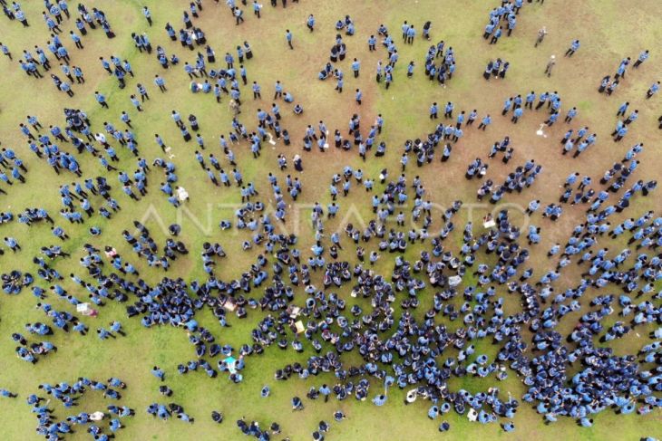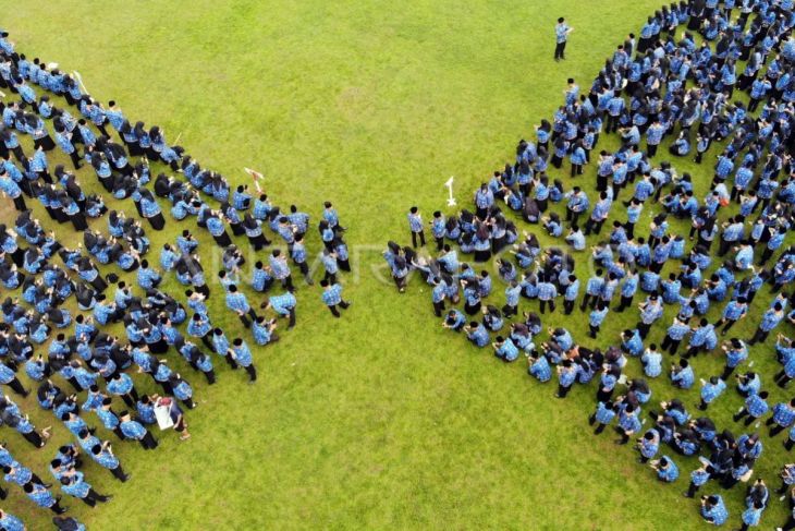 Foto udara sejumlah Pegawai Pemerintah dengan Perjanjian Kerja (PPPK) dan Aparatur Sipil Negara (ASN) saat mengikuti pelantikan di Lapangan Tegar Beriman, Cibinong, Kabupaten Bogor, Jawa Barat, Kamis (17/4/2025). Pemerintah Kabupaten Bogor melantik 3.324 orang PPPK dan ASN sebanyak 345 formasi tahun 2024. ANTARA FOTO/Yulius Satria Wijaya/foc.