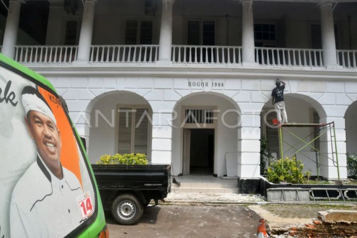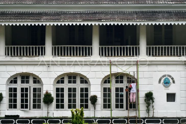 Pekerja mengecat dinding gedung Badan Koordinasi Pemerintahan dan Pembangunan Wilayah (Bakorwil) di Kota Bogor, Jawa Barat, Rabu (7/5/2025). Gedung Bakorwil yang merupakan bangunan cagar budaya dan berubah nama menjadi Bale Pakuan Padjadjaran tersebut diperbaiki untuk dijadikan kantor Gubernur Jawa Barat Dedi Mulyadi yang akan memonitor lima wilayah, mulai dari Kota dan Kabupaten Bogor, Kabupaten Cianjur, Depok, dan Sukabumi. ANTARA FOTO/Arif Firmansyah/rwa.
