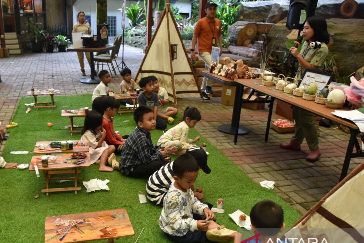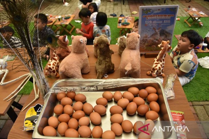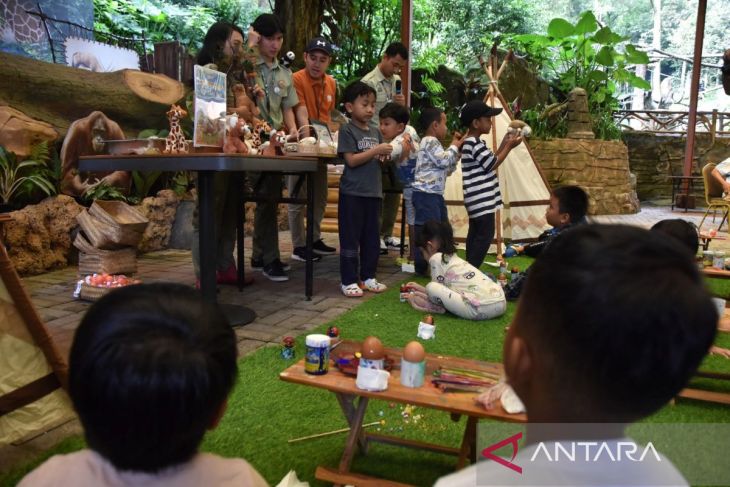 Sejumlah anak mengikuti edukasi tentang telur atau Egg Corner di Caravan Resto, Taman Safari Indonesia (TSI), Cisarua, Bogor, Jawa Barat, Minggu (5/4/2026). Safari Resort menggelar edukasi dan perlombaan sambut Hari Paskah seperti Egg Corner, Egg Hunting atau berburu telur dan Egg Painting atau melukis telur dengan tujuan melatih kemampuan fisik dan motorik anak serta mengangkat sisi konservasi dan edukasi satwa. ANTARA Megapolitan/Arif Firmansyah.