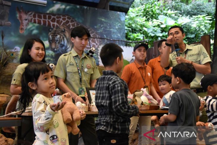 Sejumlah anak mendapatkan hadiah boneka usai mengikuti perlombaan sambut Hari Paskah di Caravan Resto, Taman Safari Indonesia (TSI), Cisarua, Bogor, Jawa Barat, Minggu (5/4/2026). Safari Resort menggelar edukasi dan perlombaan sambut Hari Paskah seperti Egg Corner, Egg Hunting atau berburu telur dan Egg Painting atau melukis telur dengan tujuan melatih kemampuan fisik dan motorik anak serta mengangkat sisi konservasi dan edukasi satwa. ANTARA Megapolitan/Arif Firmansyah.